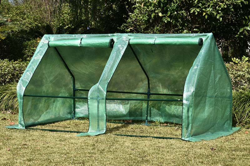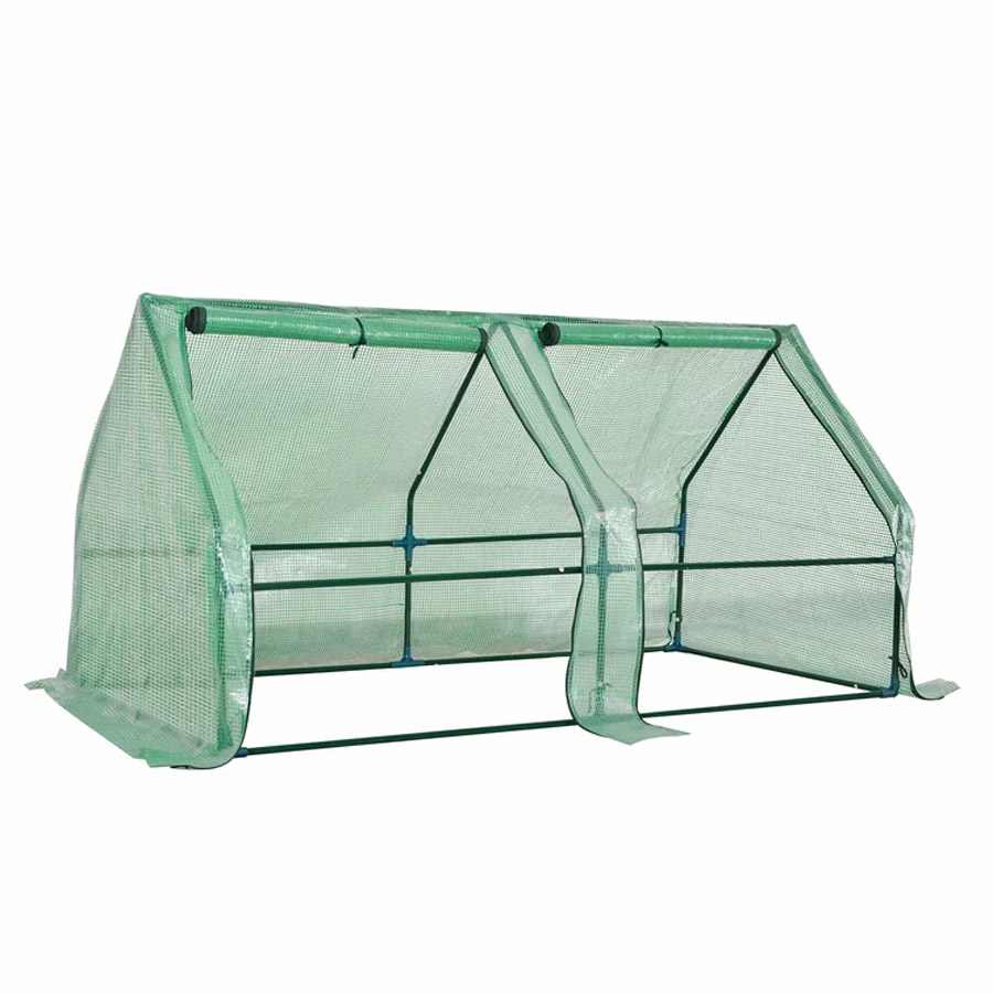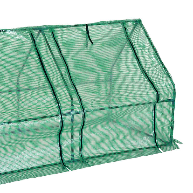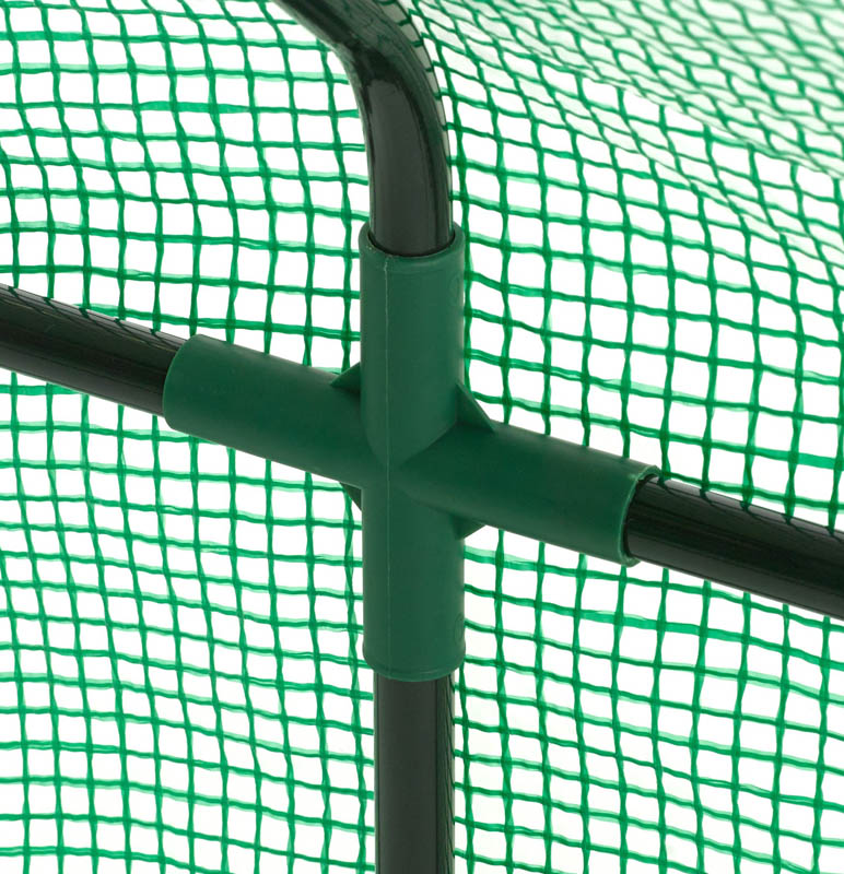 Das Gestell besteht aus pulverbeschichteten Stahlrohren. Die Hülle ist aus verstärktem 130-Gramm-Kunststoff produziert. Die Abdeckung ist unten extra lang, so dass Sie sie mit Sand beschweren können, um Ihr Gewächshaus fest zu fixieren, damit es direkt nach der Montage sicher gegen Wind und Regen isoliert ist.