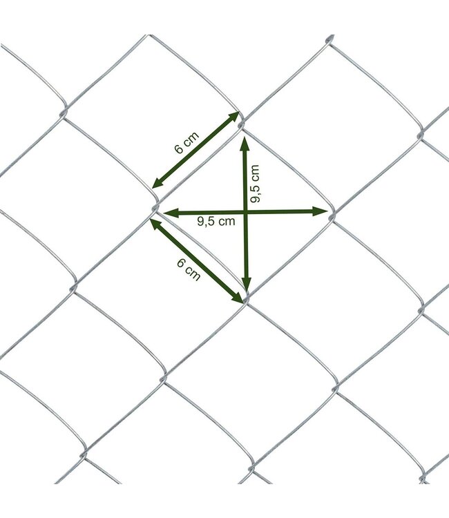 Der verzinkte Maschendrahtzaun hat eine Maschenweite von ca. 60 x 60 mm bei einer Drahtstärke von 1,8 mm.