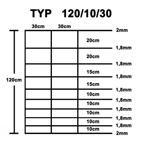 Abstand der horizontalen Drähte zueinander, von unten nach oben: 10/10/10/10/10/15/15/20/20 cm.